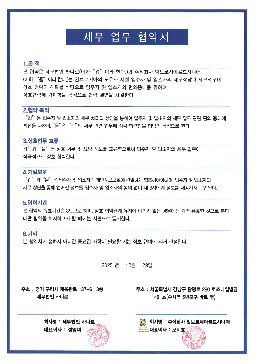 암브로시아와 세무법인 하나로는 암브로시아 입주자 및 입소자 편의 증진을 위해서
